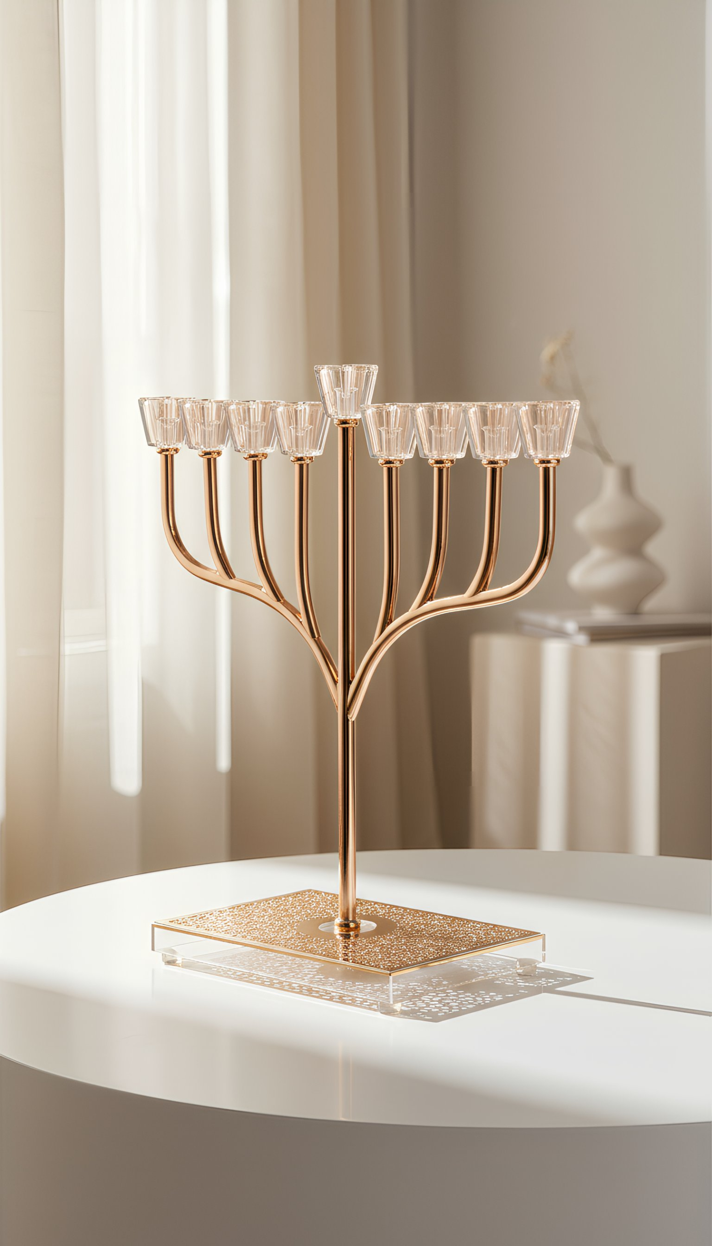 חנוכייה מעוצבת דגם שנהב, עם קנים ותחתית מזכוכית איכותית בגוון רוז גולד, בגובה 36 סנטימטר.