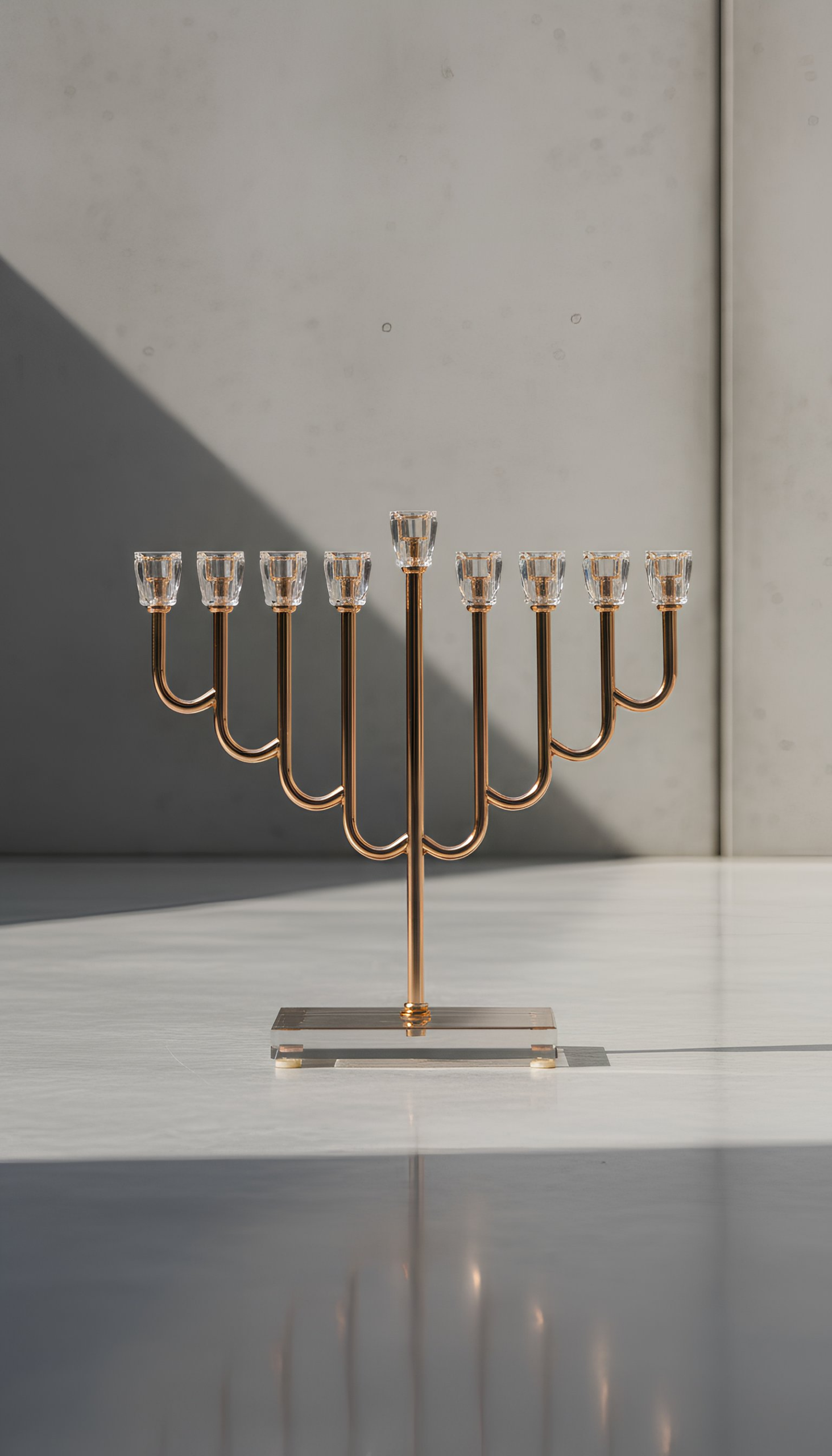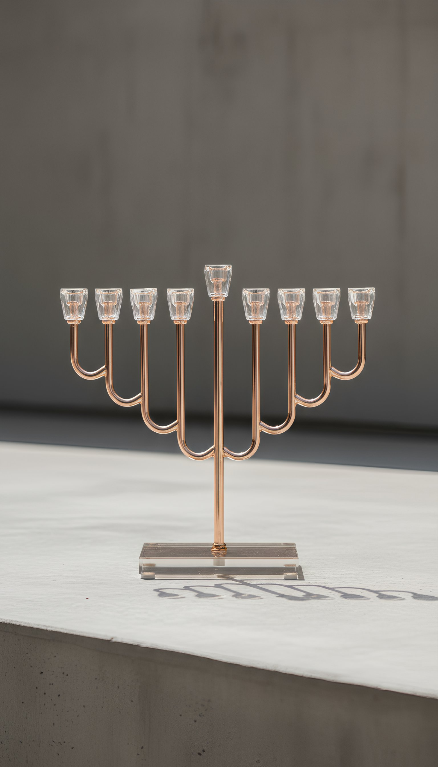 חנוכייה מהודרת דגם “שנהב” בגימור רוז גולד עם תחתית קריסטל שמוסיפה עומק ונצנוץ עדין לכל הדלקה.
