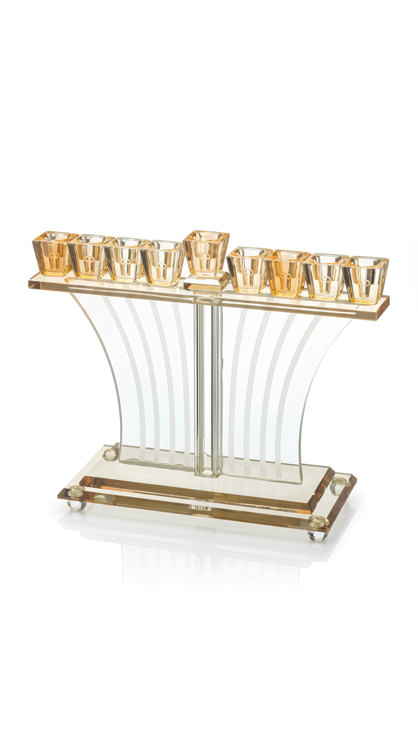 עשויה מקריסטל איכותי בעבודת יד, עם קווים נקיים וזוהר שקוף המשקף את אור הנרות בצורה מרהיבה.