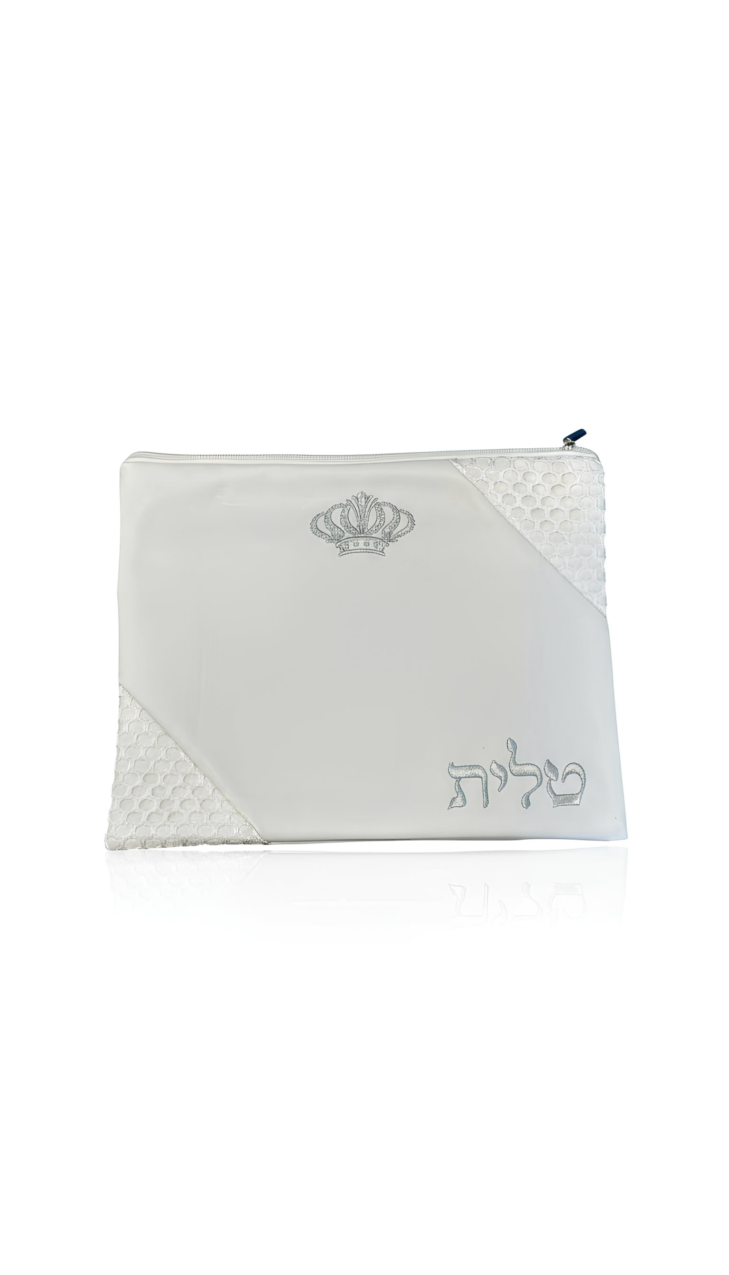 • תיק טלית ותפילין יוקרתי דמוי עור לבן עם הטבעה מובלטת – “האש שלי”