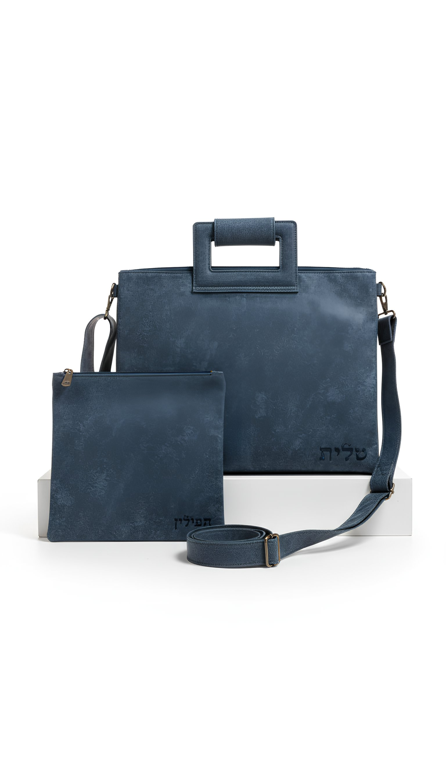 סט מהודר לטלית ולתפילין בעיצוב אלגנטי ונקי, עשוי דמוי עור איכותי בגוון כחול-אפור יוקרתי.